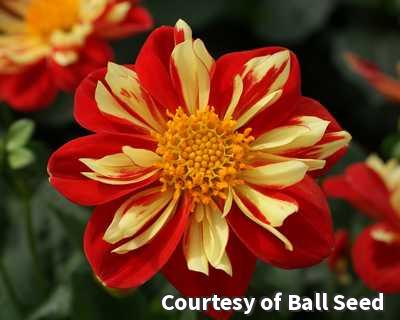 Scarlet semi-double blooms with yellow fringed centers and deep green foliage are great for cut flower gardens. Dahlias are best when they are kept clean and spent blooms are removed to promote new blooms.