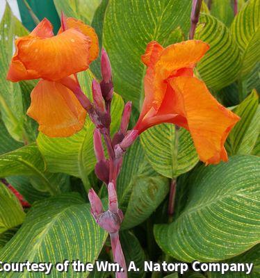 Spectacular, fast growing accent plant with extremely large striped foliage and huge beautiful iris-like flowers throughout the season. Provides a tropical look to beds or container plantings.