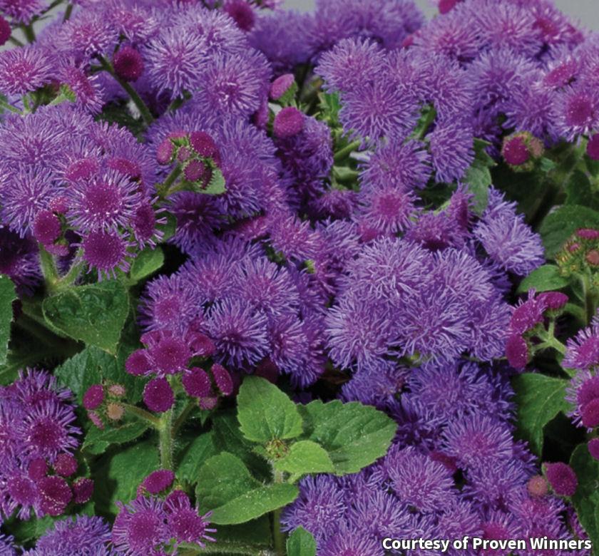 Ageratum, also called fuzz flower, has fuzzy blooms that requires no dead heading. Artist are bred to be more uniform and flower more consistently than seed grown varieties.
