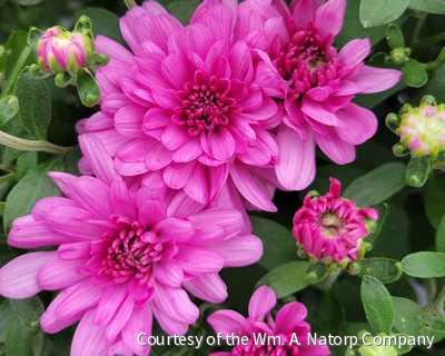 This late season mum has a mounded growth habit and brilliant colored blooms. Wanda are bred for their profuse blooms and dense branching. Mums add great fall color to the landscape. Add early, mid and late season varieties to extend the color.