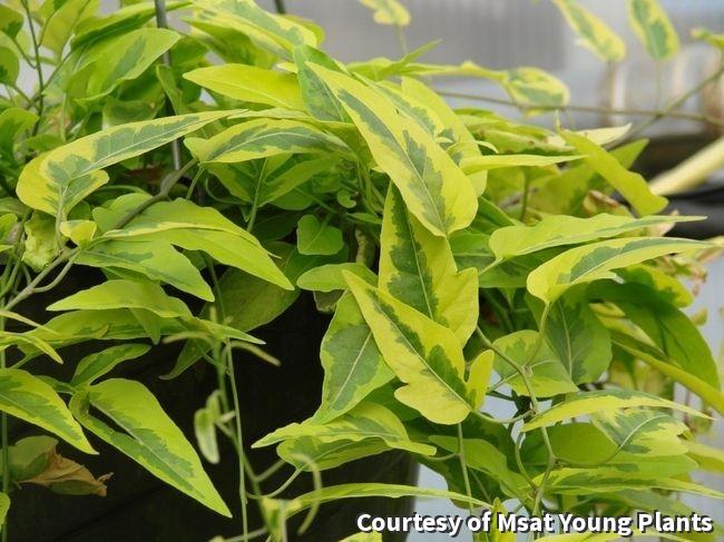 Also called variegated potato vine, this twining vine with variegated foliage has white blooms. It is a great plant for trellis, arbors or hanging baskets.