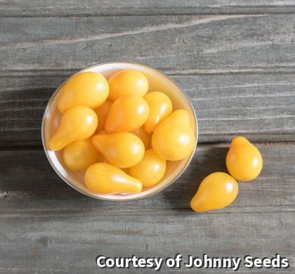 These bite sized petite 1¾" pear shaped yellow tomatoes have a delicious tangy flavor. The fruit are borne on large clusters and they can be enjoyed right off the vine.
