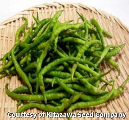 These Japanese heirloom, 4-6 inch long pencil thin peppers hang on the plant like pieces of string. They have a slightly spicy, almost bitter flavor. You will want to harvest these when they are young to get a milder flavor.