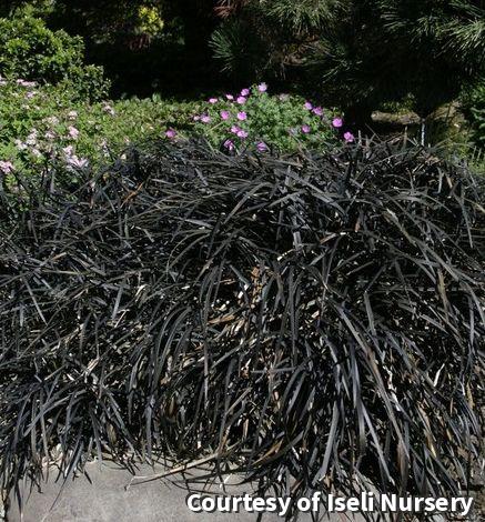 A grass-like perennial with dramatic, shiny black foliage. It is grown for the foliage, but also, has attractive blooms and shiny black fruit. Allow it to roam at the front of beds and add to containers for color and texture.