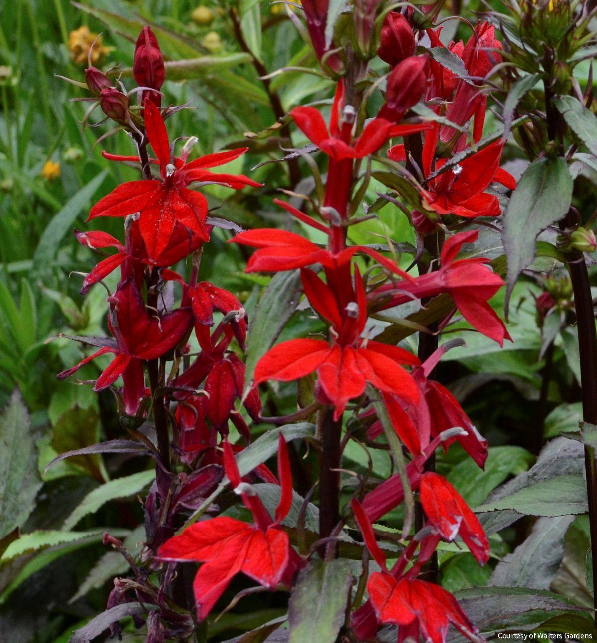 Rich cardinal red, fan shaped flowers are arranged in rows on tall flower spikes and nicely contrast the purple foliage. This late season bloomer enjoys moist to wet soil and is frequented by butterflies and hummingbirds.