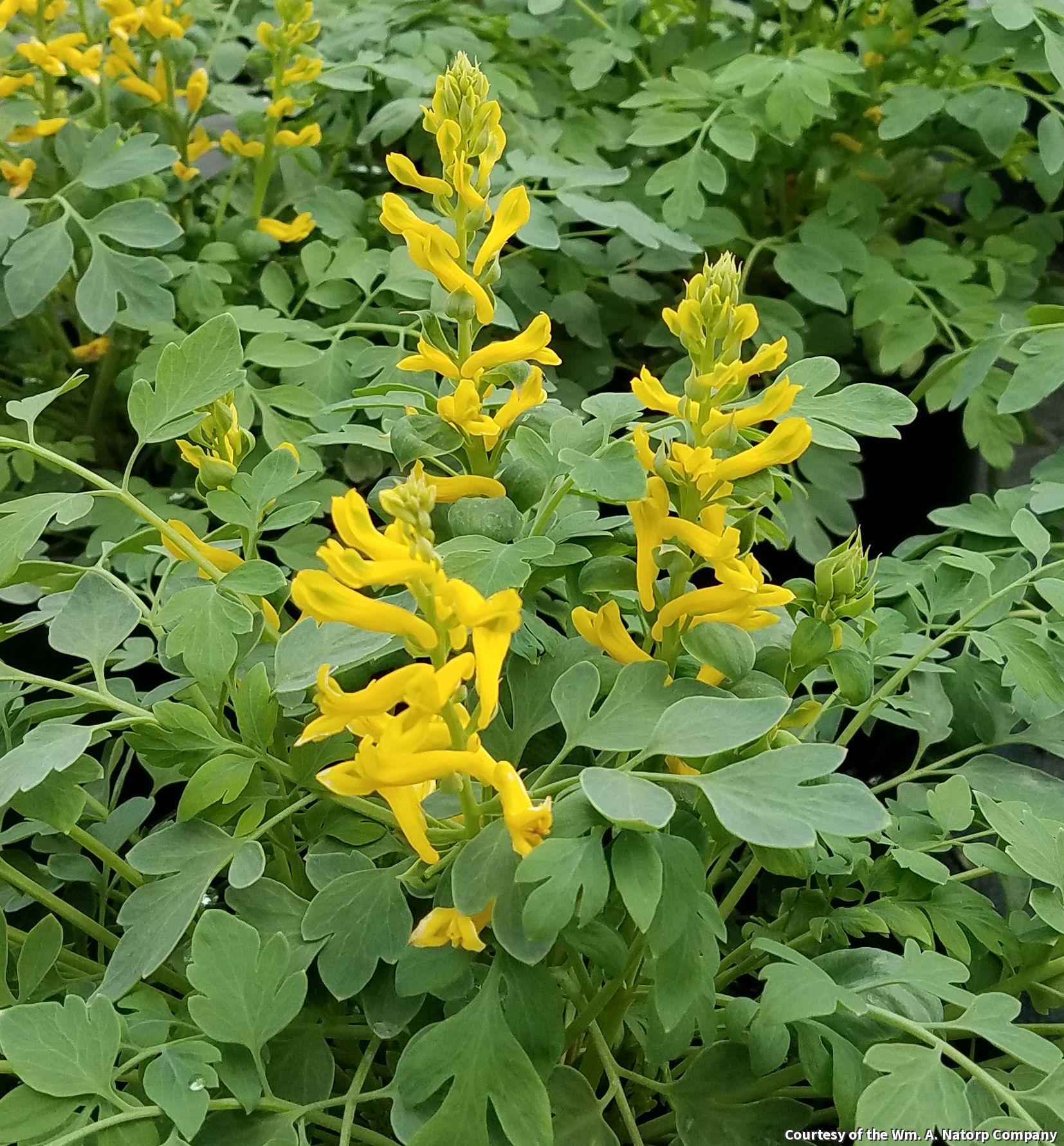 A shade lover with blue-green leaves and bright yellow tubular flowers that often, rebloom if cut back. It enjoys cool, shady garden sites and looks fabulous paired with Hostas, Brunnera and Bleeding Hearts.