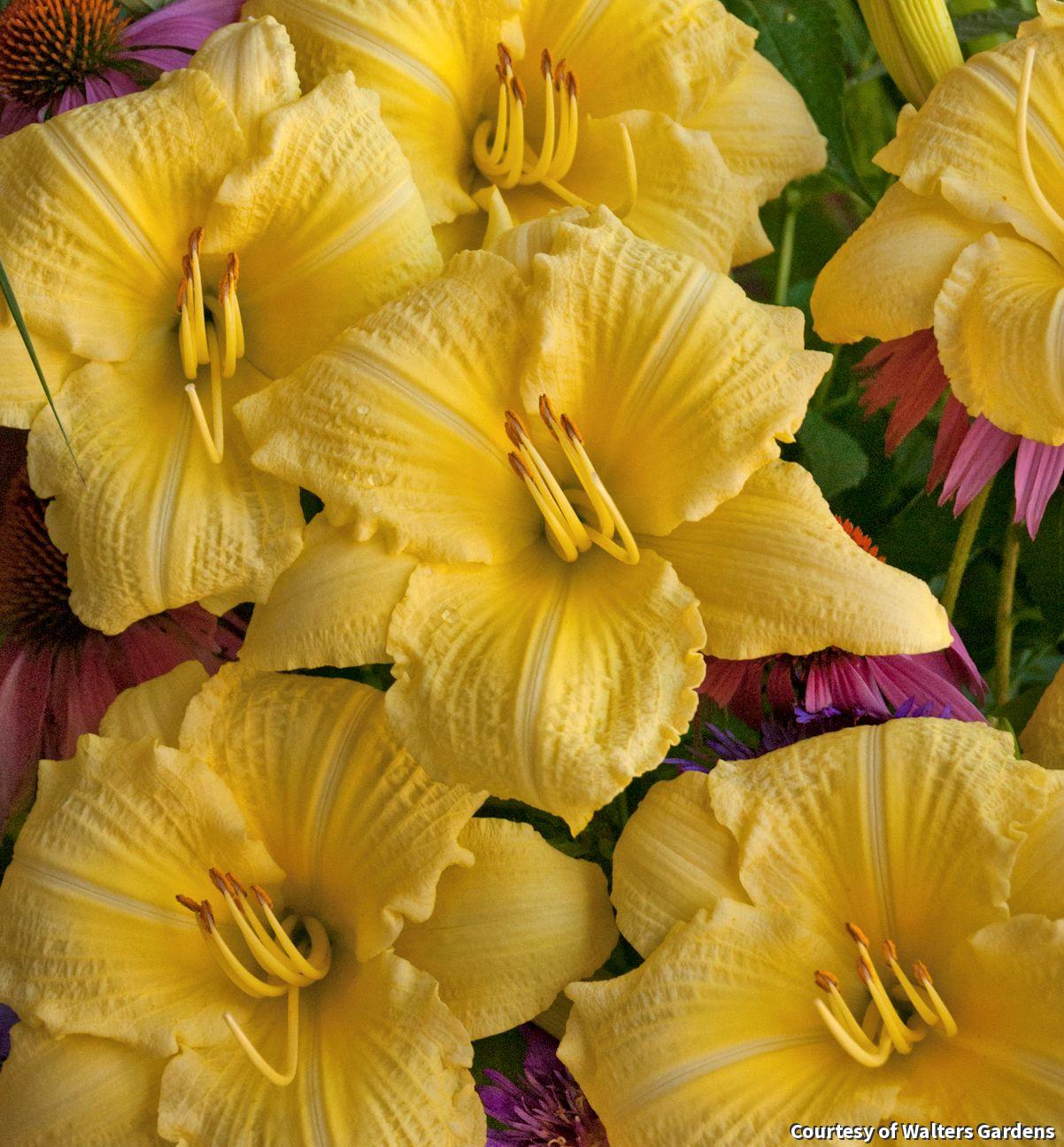 An improved bright yellow variety that blooms a couple weeks earlier than others and continues to rebloom into early fall. Its fragrant, canary yellow blooms are large and petals are slightly ruffled. It creates a beautiful splash of color in any garden.