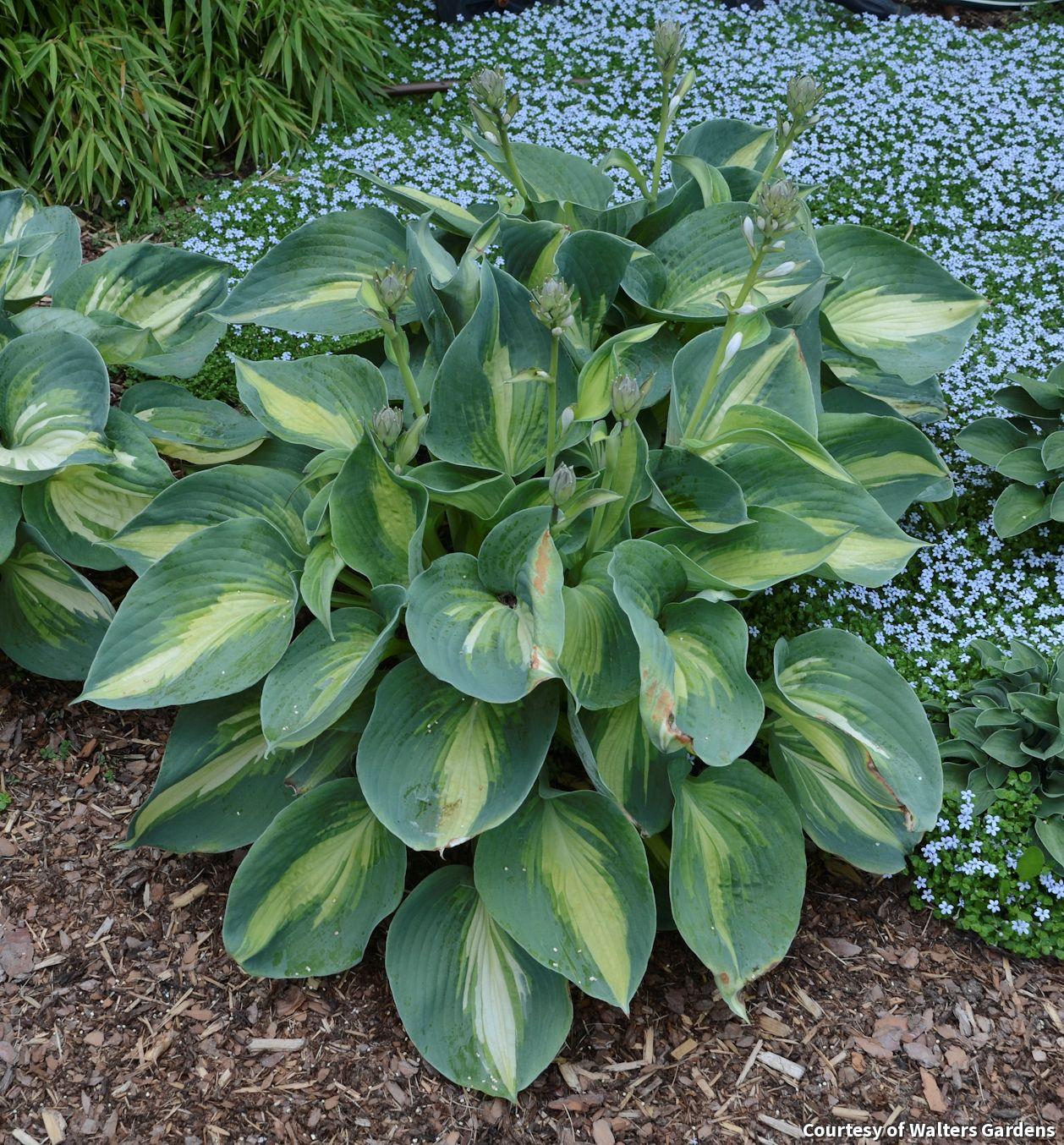 A showy, larger sized Hosta with leaves that have wide, blue edges with hints of apple green and a creamy white center. The leaves are thick and show good slug resistance. Near white flowers complete the show. It is a bold statement for shady sites.