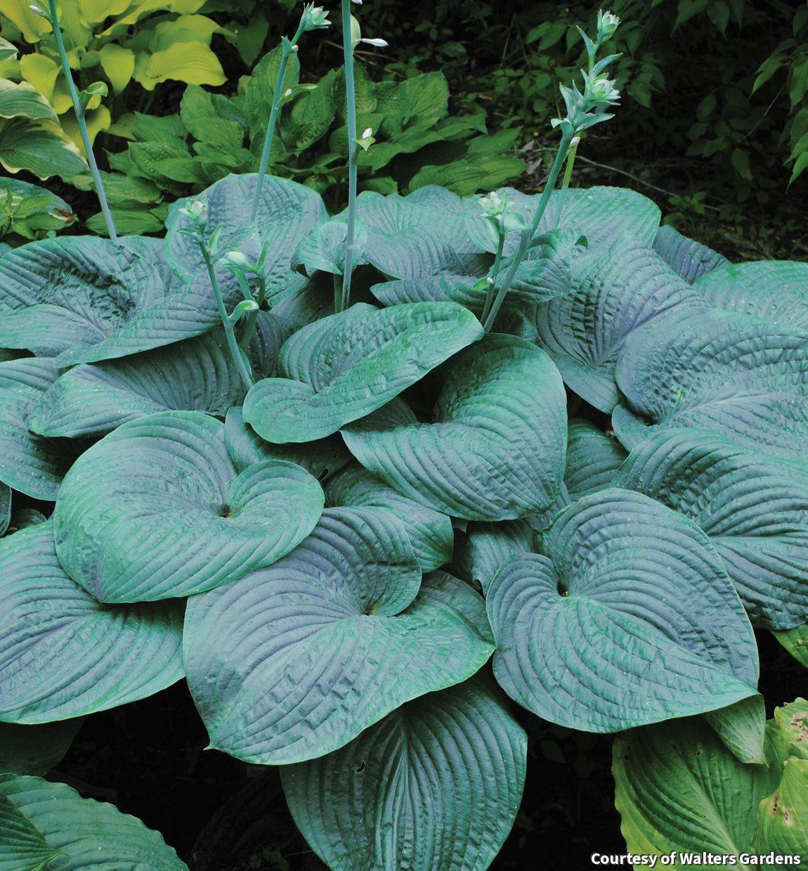 A giant size, specimen style Hosta with a mound of blue-green, corrugated, heart-shaped leaves. Leaf color is bluest in spring. White flowers add to the show in summer. Use it as a bold statement and to contrast smaller leafed plants in shady gardens.