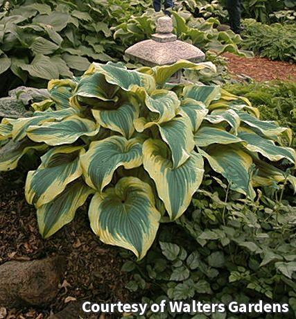 A grand Hosta with large dark green leaves with irregular gold edges. In summer, lavender flowers adorn the plant. This one is suitable for use as a focal point in shady beds and borders, or plant in masses for a stunning show.