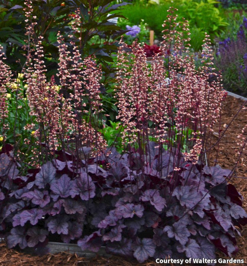 Vibrant grape purple spring foliage has black veins. The leaves have a silvery overlay in summer and turn back to deep purple for fall. Tall creamy white bloom spikes add summer interest. Add to the garden and containers for three season color.