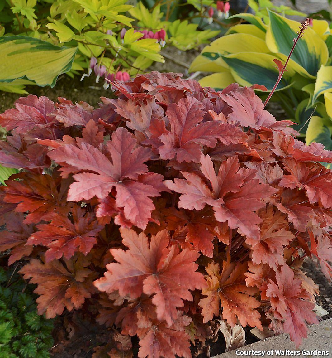 An ever changing variety with red leaves with dark centers that lighten to bronze red before turning mellow to deep green in summer. Adding to the show is creamy white blooms that rise above the foliage. Add to the edges of beds and containers.