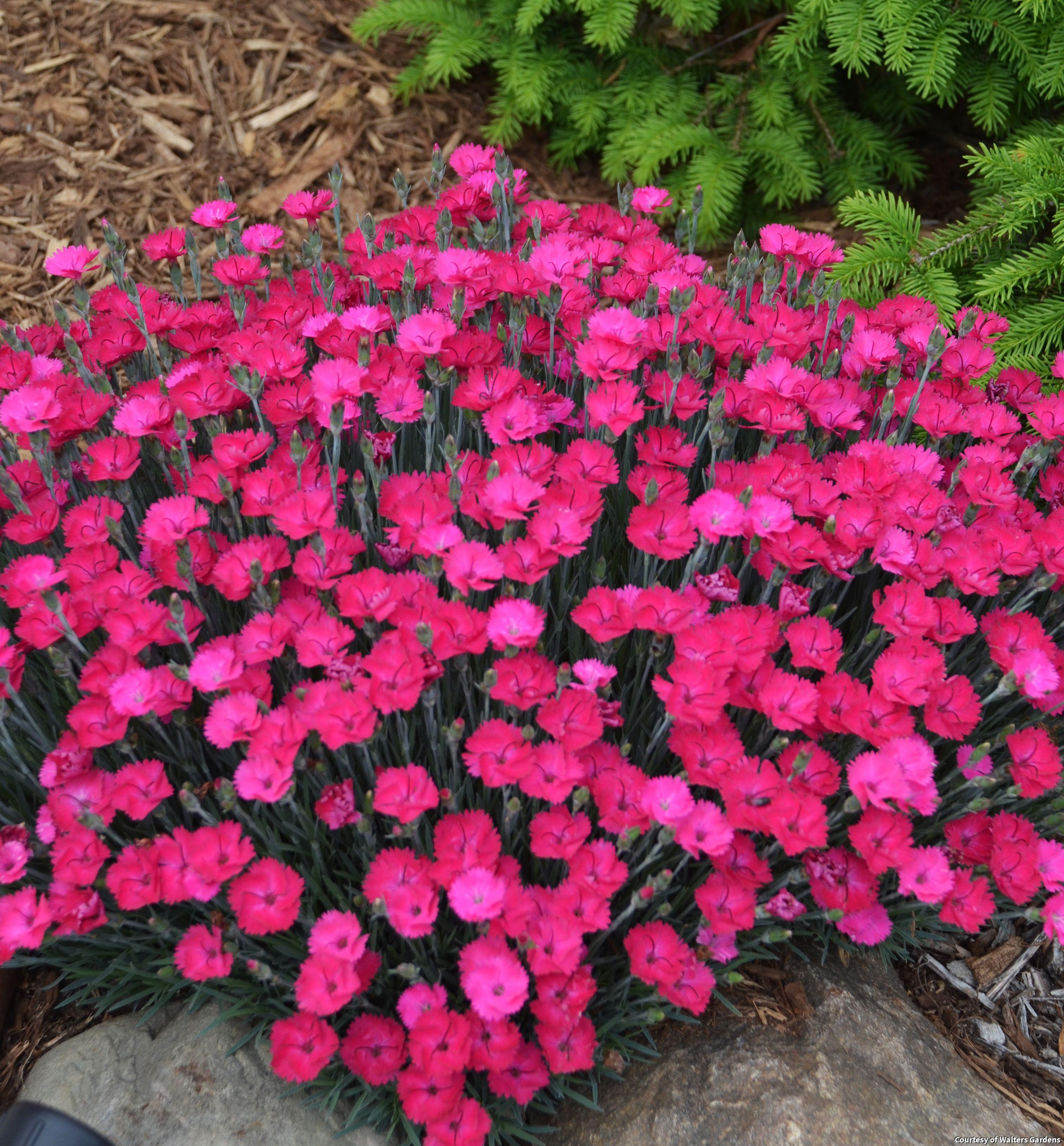 This early blooming variety has an abundance of vibrant magenta pink flowers. It is the right size for edging and planting at the front of beds. When not in bloom, the blue-gray foliage adds garden contrast. Sheer after blooming for more flowers in fall.