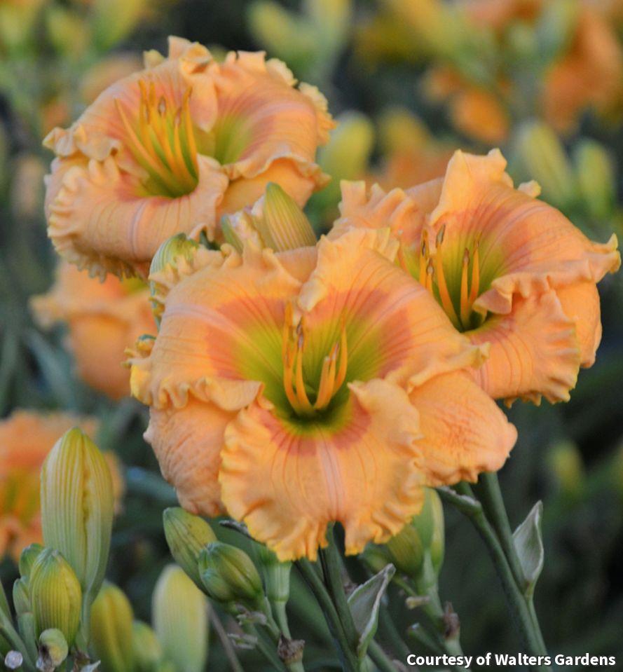 A large flowering variety with orange-mango flowers with a light rose band, pink mid-rib and green throat. Many flowers bloom at the same time for a spectacular garden show. Add to beds and borders for refreshing summer color.