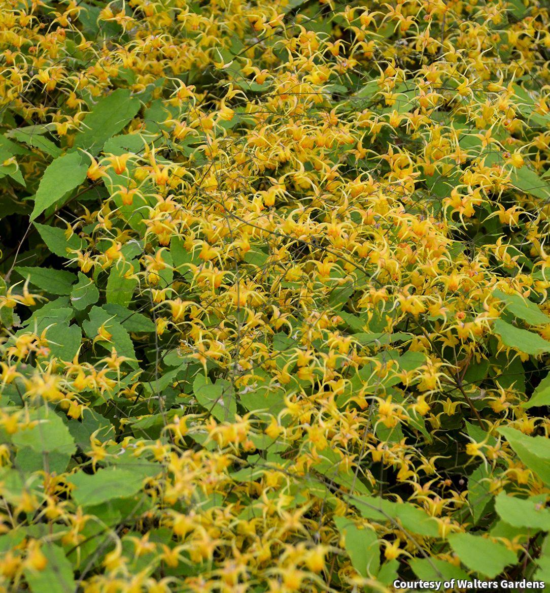A tough, drought tolerant perennial with mounds of heart-shaped foliage accented airy, bright yellow spring flowers with orange centers. The flowers are on long stems that display well in shady gardens and woodland settings.