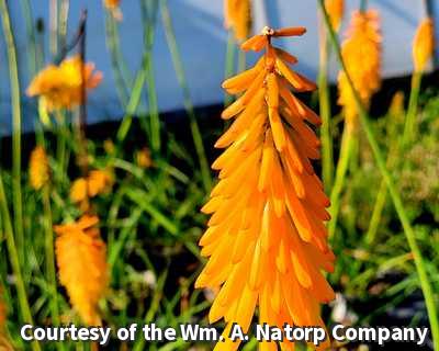 Abundant flower spikes with torch-like, mango-orange flowers adorn the summer garden and often, repeat bloom. The foliage is sword-like and is attractive all summer. This very drought tolerant plant is easy to grow in beds and borders.