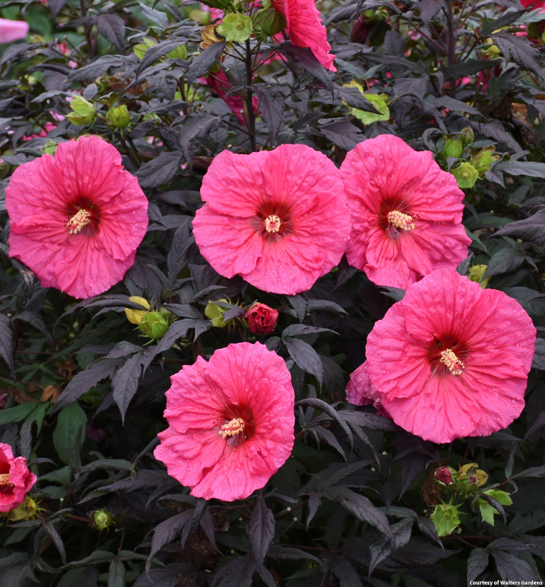 A dramatic Hardy Hibiscus with hot pink blooms and dark purple (almost black) foliage. The foliage contrasts green leaf plants well and the flowers light up the summer garden. Use as an accent or plant in groups for an even more dramatic show.