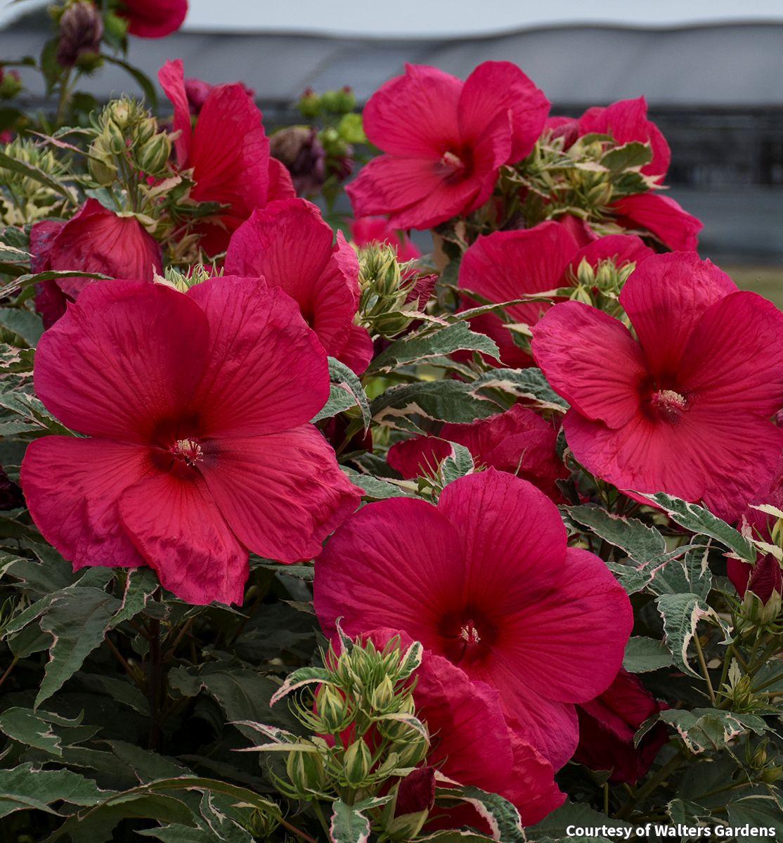 A three season Hibiscus with variegated foliage and rich magenta pink flowers that light up the summer garden. The foliage is green and white with a hint of blush on the edges. It has good vigor and grows beautifully in sunny beds and borders.