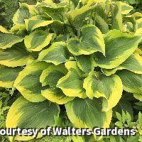 A wide variety with slightly rippled leaves with dark green centers and golden yellow edges. The yellow band is wider in more sun. Given time, this beauty will become a specimen in woodland and shady gardens.