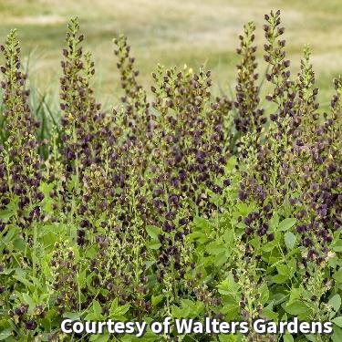 A large, dramatic perennial with nearly black, charcoal purple flower spikes in late spring to early summer. This bold plant is easy to grow and adds interest to the middle or back of borders and beds. Attractive seed pods follow the blooms.