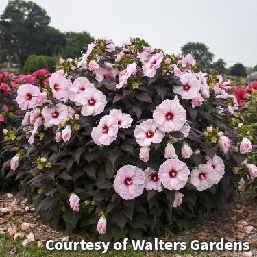 A dramatic, hardy perennial with wine-purple foliage and super large white flowers with a cherry red eye and dark pink veining. This is a large variety that adds color and texture to beds and borders. Add a grouping for a dynamic summer show!