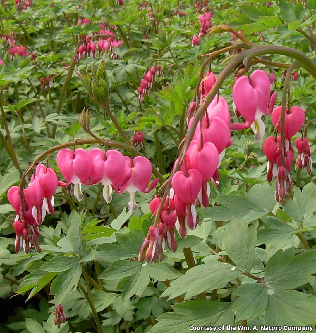 An old fashioned favorite with graceful heart-shaped pink flowers that fall from arched stems in spring. The foliage is soft and fern-like. It enjoys moist, shady sites with morning sun. Add it to beds and borders as well as woodland sites.