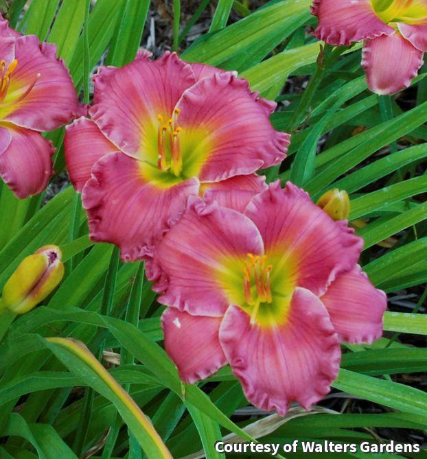 An everblooming variety with rosy red, ruffled flowers with a yellow throat. A shorter stature, numerous blooms and continual blooming make this an exciting additions to beds, border and containers.