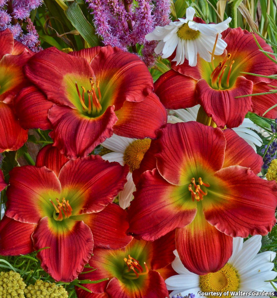 A reblooming variety with brilliant cherry red, ruffled blooms with a yellow and apple green throat. This vigorous grower has an exceptional bloom performance and adds all summer color to beds and borders.