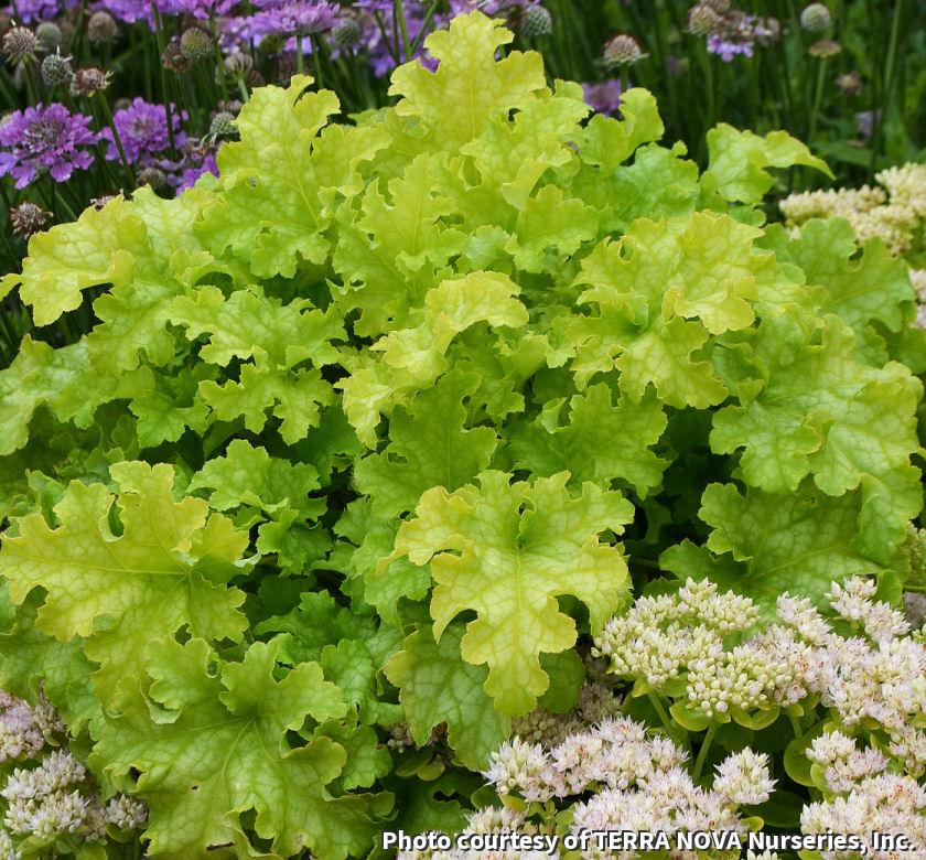 Large, ruffled lime green leaves add garden color from spring to fall. This heat tolerant variety forms a rounded mound and is suitable for the garden or containers. White flower spikes in summer add additional interest.