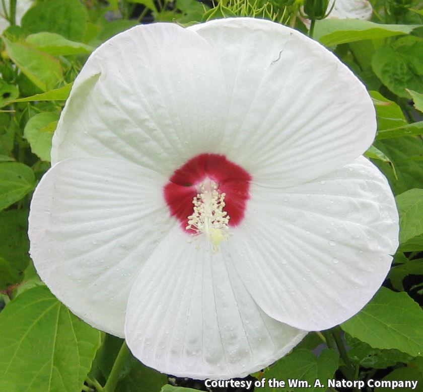A compact variety of hardy Hibicus with large, white blooms with a maroon eye. This is a heat and drought tolerant variety that adds color to the late summer garden. It is easy to grow and complements perennial beds and mixed shrub borders.
