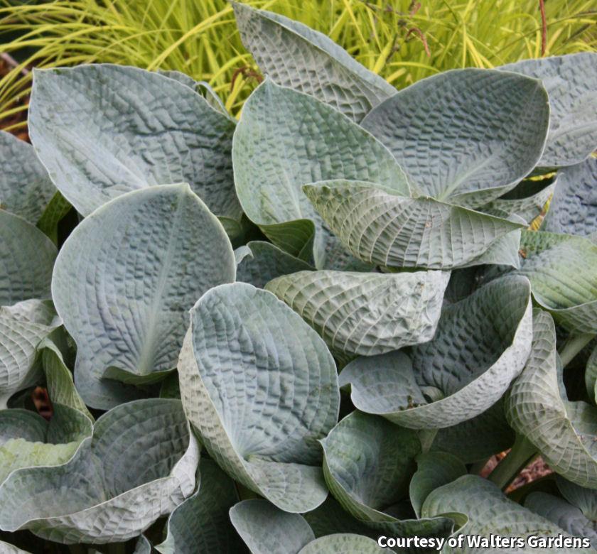 A large Hosta with lots of character. It has chalky blue leaves that are thick and rounded. The leaves become more cupped and puckered when mature. In summer, white flowers accentuate the leaves. This one makes a great specimen for beds.