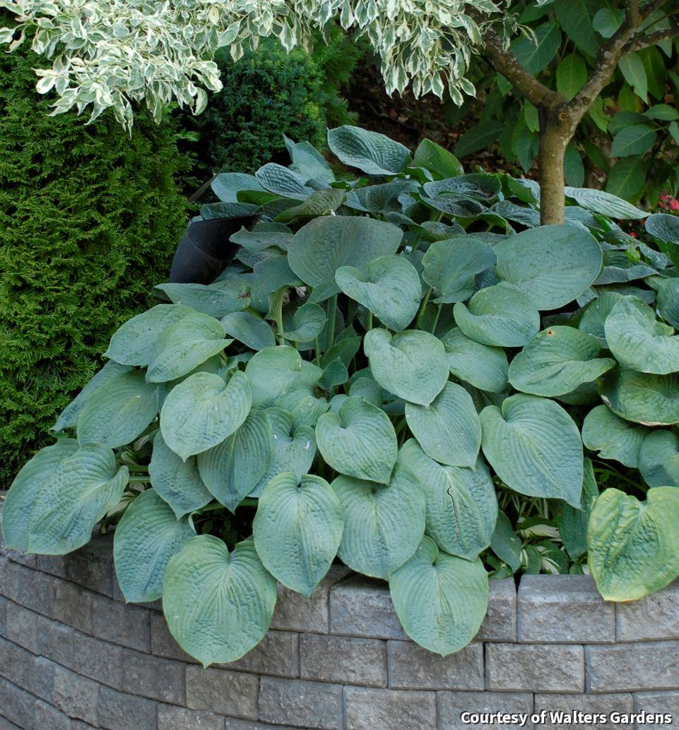 A striking Hosta with huge, blue-green leaves with heavy texturing. The foliage is accented by large white summer blooms. This slug resistant variety makes an excellent specimen plant in shady gardens.