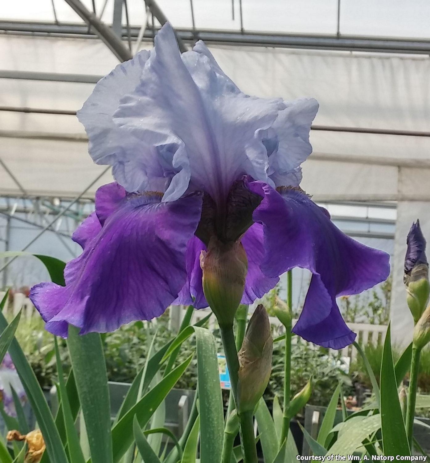A distintive re-blooming iris with light blue petals on top and dark blue petals on the bottom. It enjoys sunny gardens where it blooms in the spring and repeats in the fall. It makes an excellent cut flower, too.