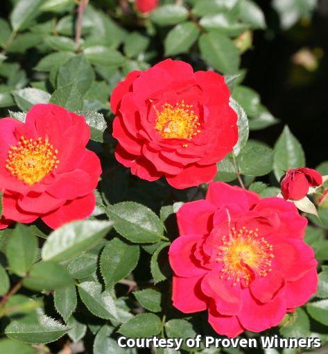 A true red rose with semi-double flowers from May through frost. The glossy green foliage is highly disease resistant and the flowers do not need deadheading. This is a true low maintenance rose for beds and borders.