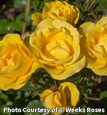 A stunning traditional petalled rose with non-fading yellow color. It has large, glossy green leaves that have excellent disease resistance. It pairs well with purple flowered roses or perennials.