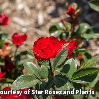 A miniature Knock Out rose with fire engine red flowers that keep their color well. The tree form is easy to maintain but does need winter protection (heavy mulch and wrapped with insulation) and makes a colorful focal point in beds and borders.
