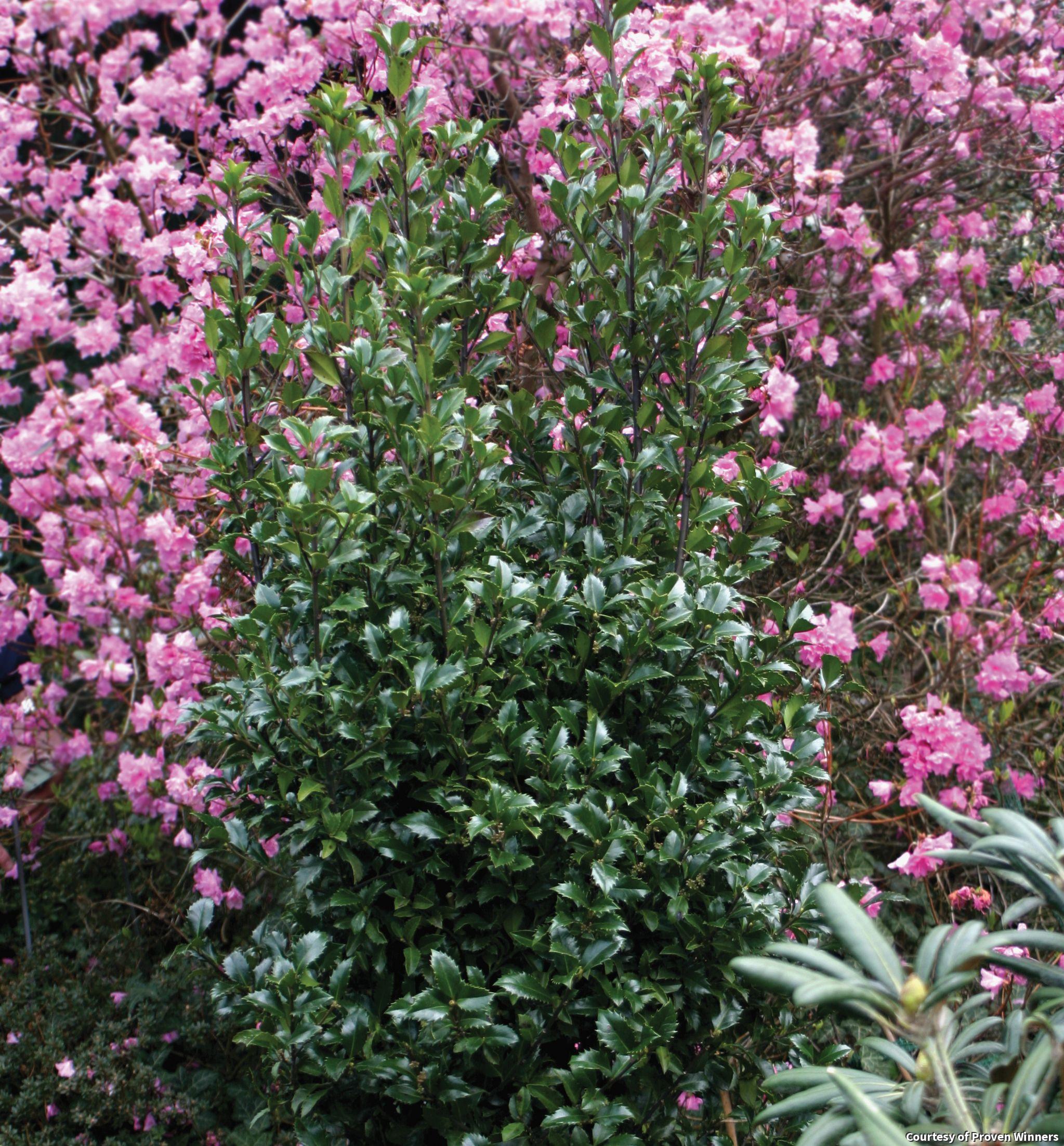 A narrow, upright holly ideal for hedges and foundation plantings. It has dark, glossy green leaves and good vigor. It is a male vareity that does not produce fruit, but will pollinate female hollies such as Castle Spire.