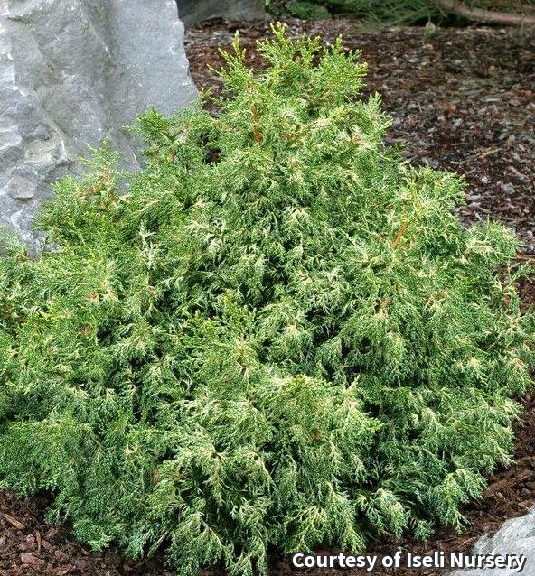 Mounding evergreen with super fine, lacy foliage with creamy speckles. The speckles are rich gold in full sun and take on a white tone in part sun. Makes a great foundation accent shrub or use as a feature in beds and borders.