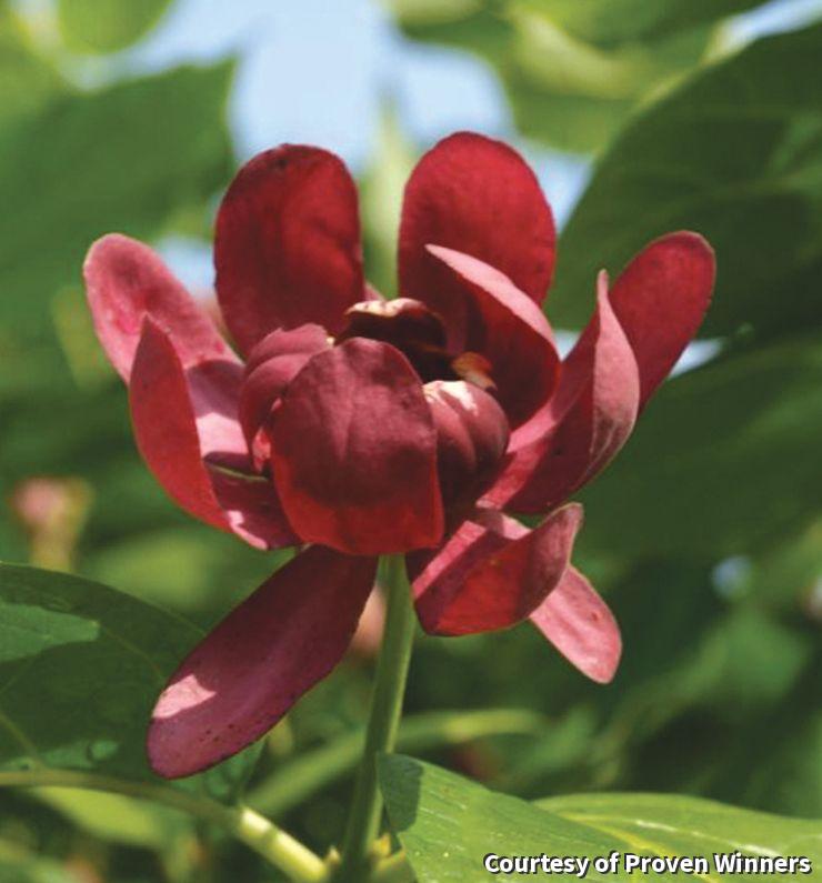 A tall, early summer blooming shrub with fragrant, bright red magnolia-like flowers that often rebloom. The blooms smell similar to apples. The glossy foliage is attractive and makes a beautiful addition to mixed borders and beds.
