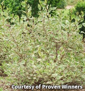 A colorful shrub with green and cream leaves with hints of pale pink. This beauty has great fall color and vibrant red stems through the winter. Enjoy it as a bright addition to mixed shrub plantings and as a hedge or garden focal point.