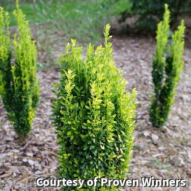 An evergreen shrub that adds color to both the landscape and containers. It has golden foliage that shows off year round, handles harsh winters and full sun without discoloring. It makes a beautiful accent, border plant and thriller in containers.