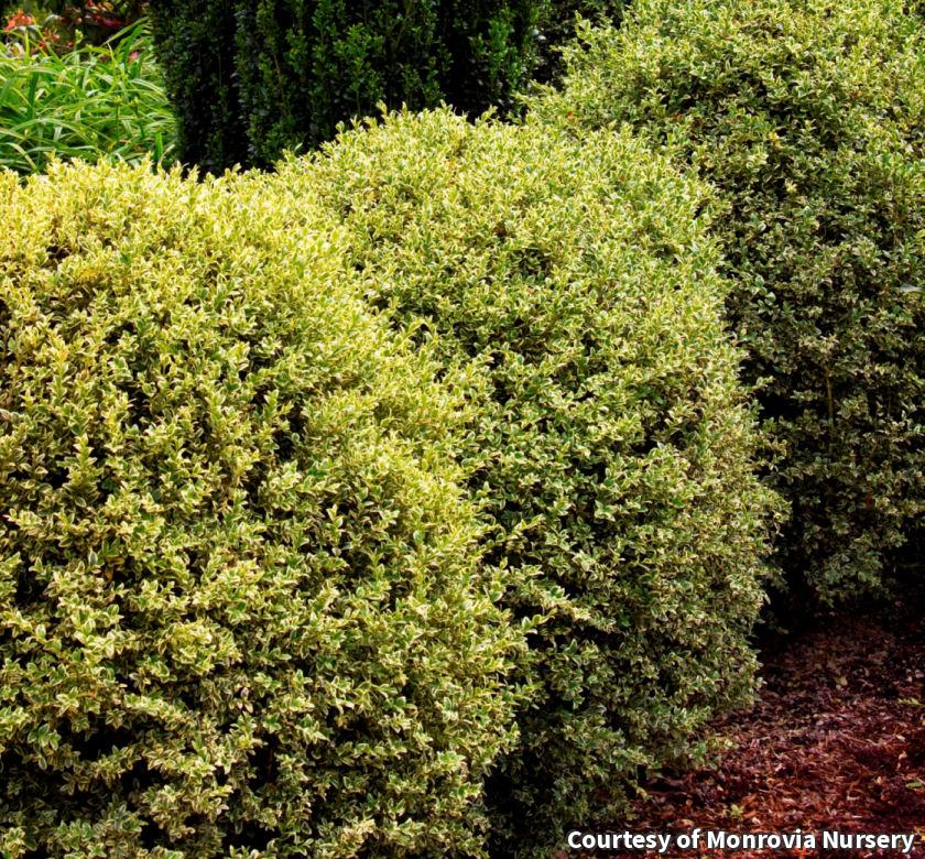 A variegated variety with bright green evergreen leaves with a white edge that turns creamy yellow as the season progresses. It is an excellent accent shrub for moist, acidic soils and a protected location. It shears well to any shape.