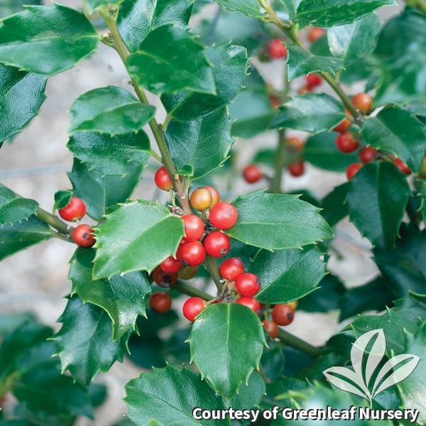 A female holly with evergreen foliage. Abundant red berries develop in the fall and last into winter. Slow growing and easy to prune. Needs a male pollinator such as 'Blue Prince' for berries. Add peat moss to amend the soil when planting.