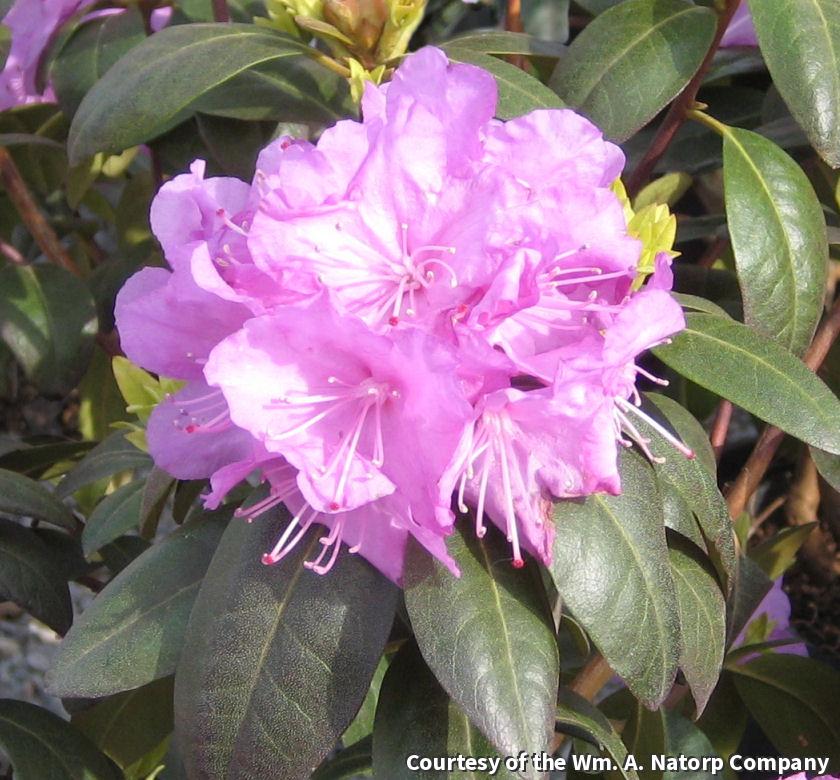 A compact bushy grower with lavender to pink flowers in April and dark green, evergreen foliage that turns bronze in cool weather. It grows best in moist, well-drained, acidic soils and is better adapted to the Tri-State than most other varieties.