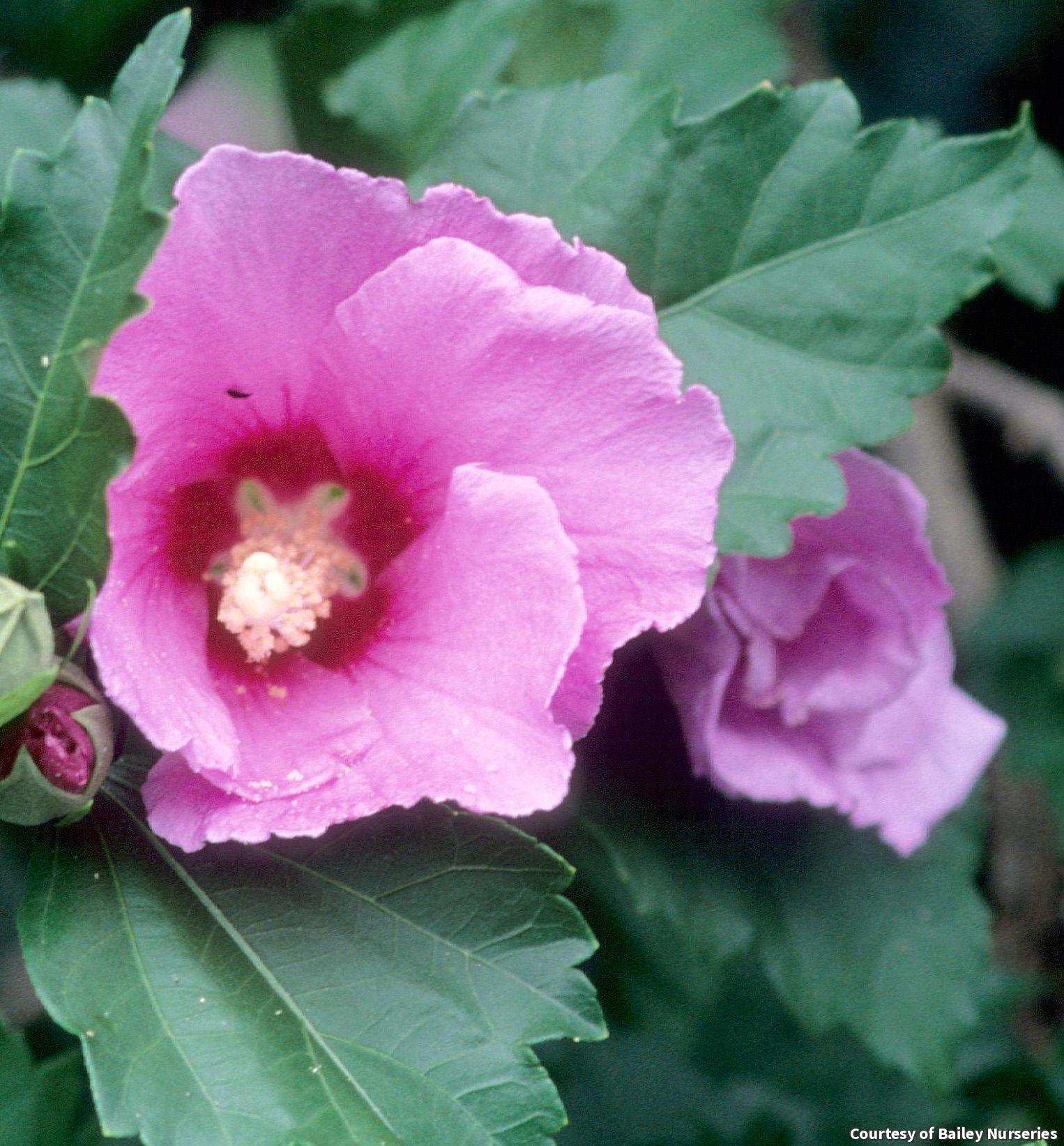 A medium sized shrub with lavender flowers with a red center. This summer bloomer has abundant flowers and is also, easy to grow in urban conditions. Add it to beds and borders or use as a hedge or screening shrub.