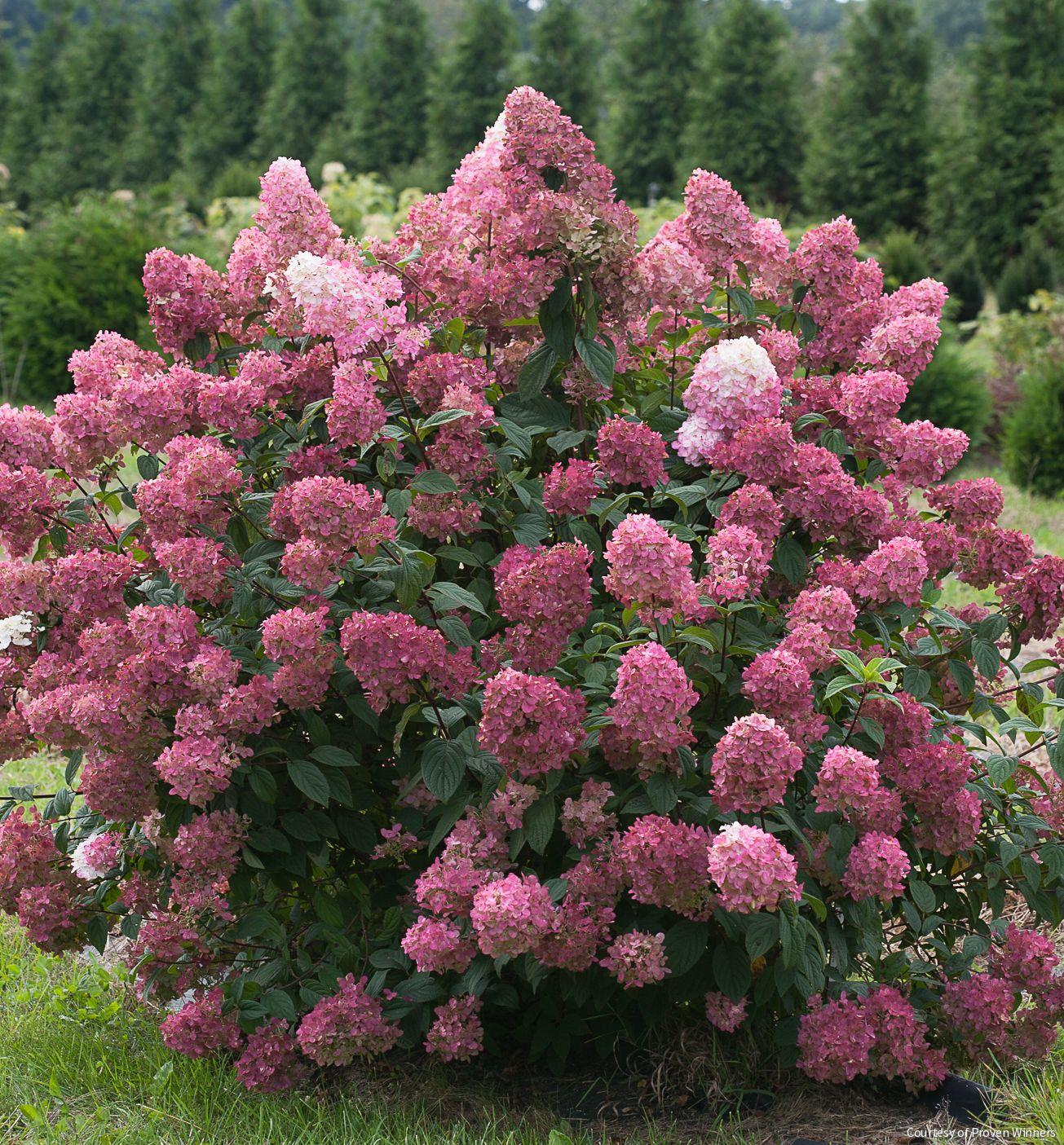 A compact variety that makes a big show in the late season garden. The large blooms are held by strong stems. They open white and turn deep reddish pink. Add to the back of beds and to mixed shrub plantings.