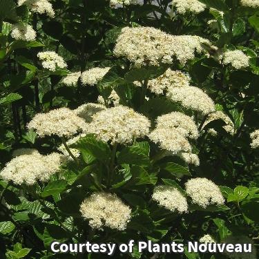 A popular upright, rounded shrub with clusters of creamy white blooms and attractive glossy green summer foliage. Yellow fall color and bluish-black fruits last into winter. It grows best in moist sites, but very adaptable and easy to grow.