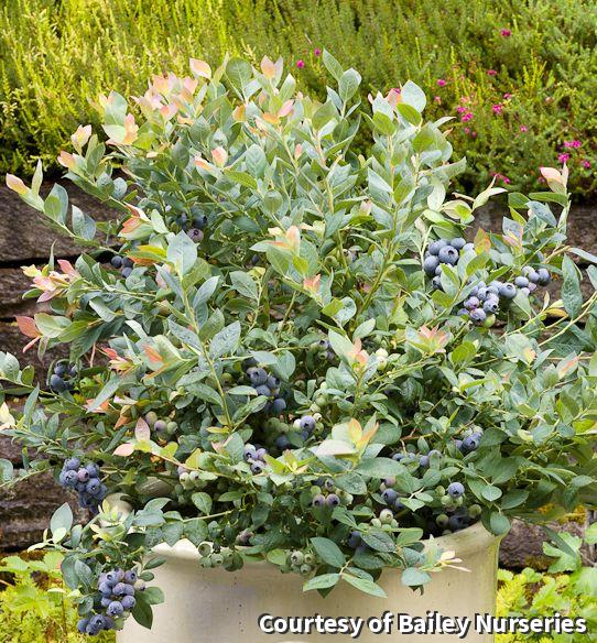 The perfect combination of beautiful foliage and edible fruit. New foliage is pink with blue hues which turns iridescent blue in winter. Blueberries are sweet. Add to the landscape or to containers.