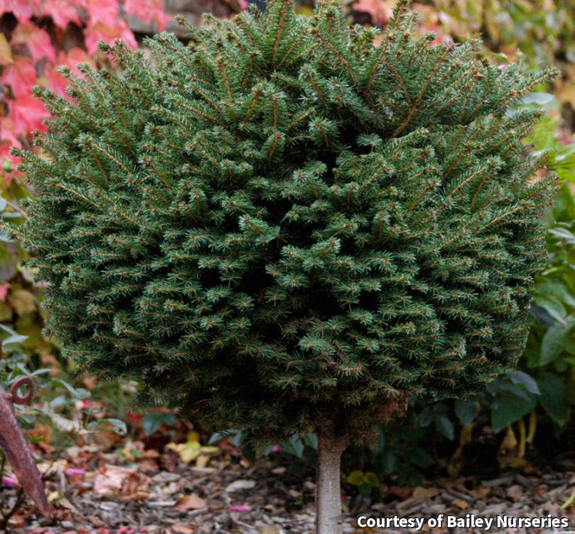 A dwarf type of Spruce with deep green needles and a rounded shape. The foliage makes a dense nest-like mound and creates a neat, formal standard. Its height is determined by the stem height. Use as a specimen plant or central plant in a container.