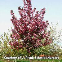 A great three season tree with bright magenta-pink flowers, Purple-red leaves that bronze with age, orange-red fall color and deep red fall fruits. It is an upright, oval shape and easy to grow. Use as a lawn tree in sunny areas.
